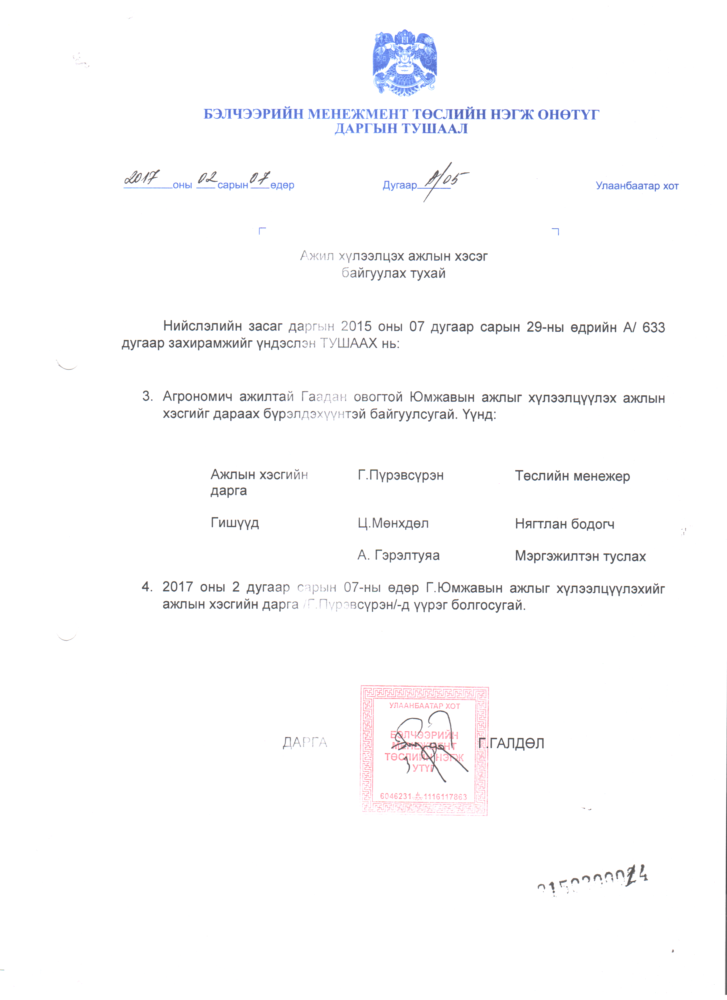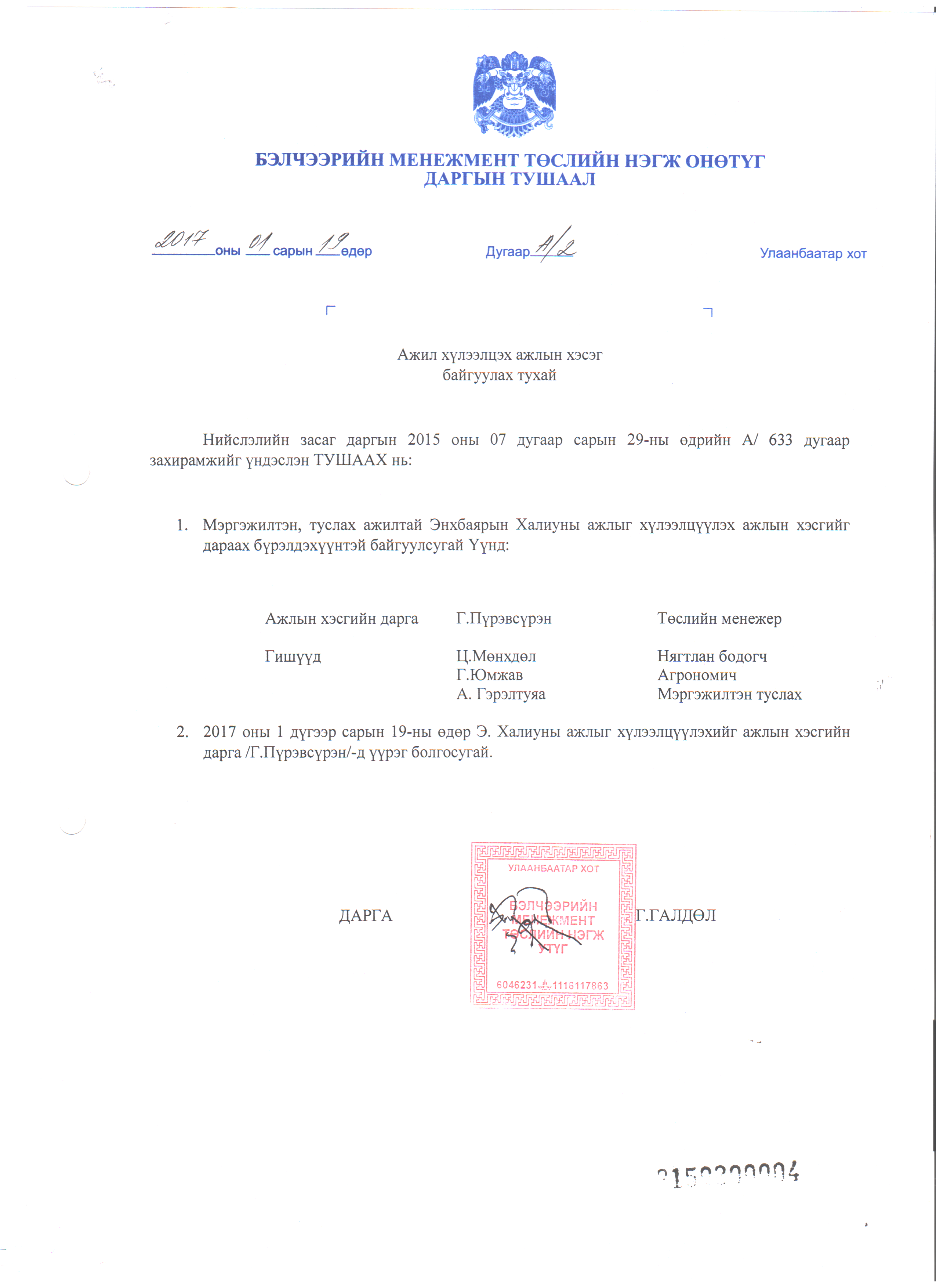 - А-14 Байгууллагын тамга тэмдэг түших, хэвлэмэл хуудас хариуцан ажиллах тухай